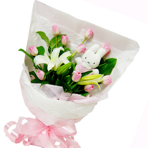 (粉色鬱金香10朵.香水百合.葉材.米飛兔1隻) ※ 尺 寸 規 格 高:40cm 寬:30cm